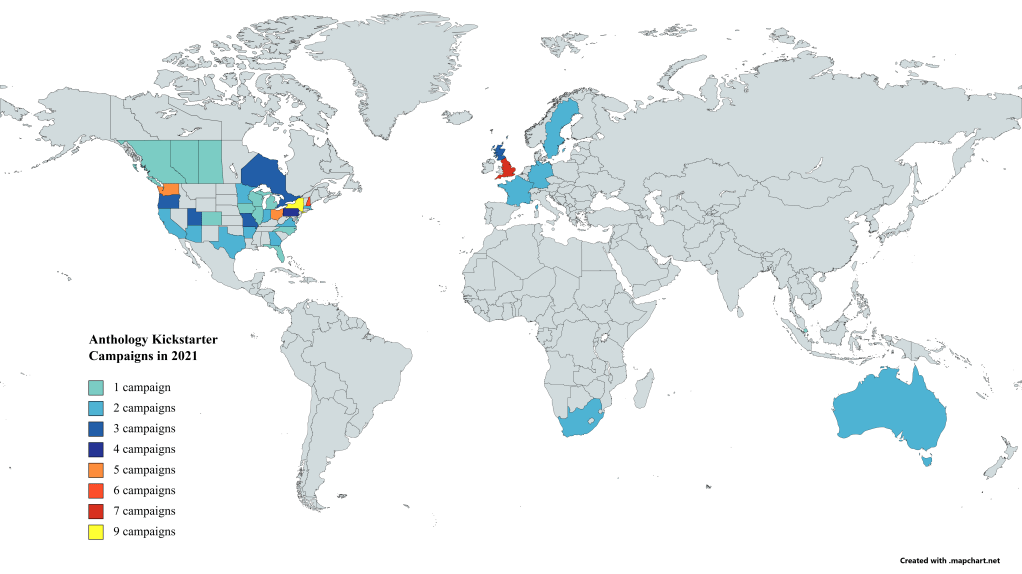 If your multi-author anthology campaign was successful in 2021, you probably launched it from the United States, and it probably fit into the genre(s) of science fiction, fantasy, or horror because these three genres accounted for 73% of such anthology campaigns.