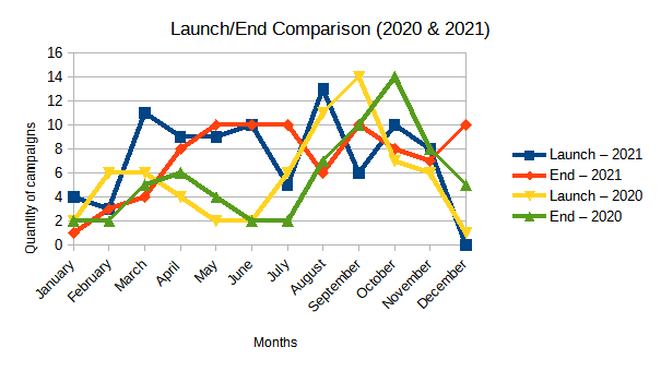 In 2021, August was the most popular month to launch an anthology Kickstarter campaign, while… there was apparently no popular month to end one! May/June/July was the most popular… quarter(?) to end one.