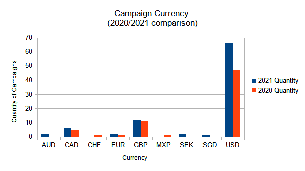 Given the distribution of campaign locations, it shouldn’t be a surprise that in 2020 and 2021, the most common anthology campaign currencies were: